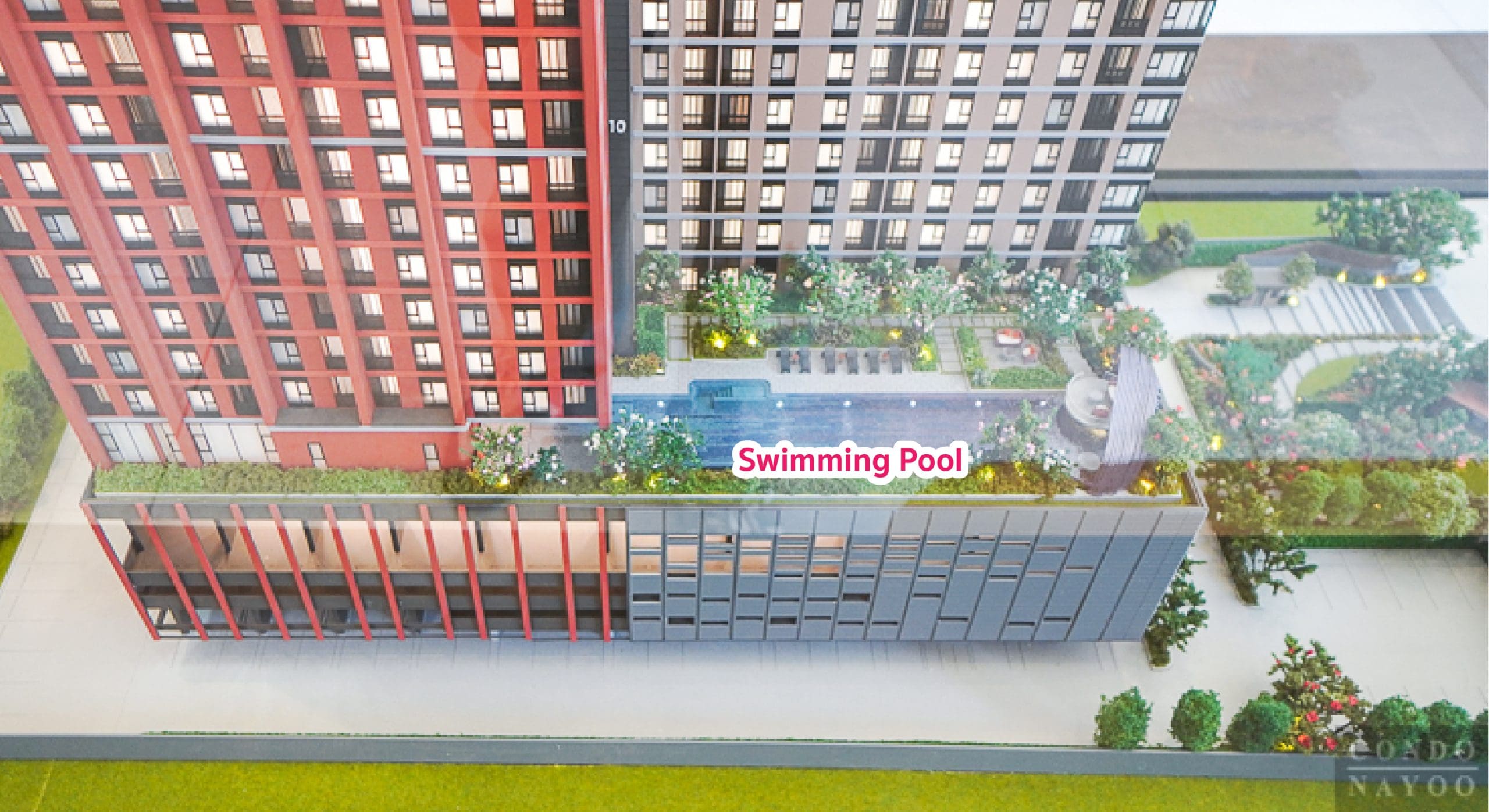 ที่ชั้น 5 มีสระว่ายน้ำระบบเกลือขนาด 35 x 5 ม. พร้อมสระเด็กและพื้นที่พักผ่อนริมสระ และมี Step Garden พื้นที่สวนพักผ่อน ห้องฟิตเนสพร้อมเครื่องออกกำลังกายครบครัน และ Multi Purpose Room
