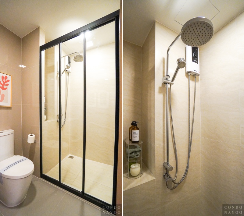 ด้านในเป็นพื้นที่ส่วนเปียก ติดตั้งฉากกั้นอาบน้ำแบบบานเลื่อน 3 ตอนมาให้ ภายในติดตั้ง Rain Shower & Hand Shower และเดินงานระบบไฟฟ้าติด Junction Box รองรับสำหรับการติดตั้งเครื่องทำน้ำอุ่นมาให้เรียบร้อย พร้อมช่องวางอุปกรณ์อาบน้ำด้านข้าง