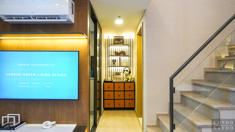 ส่วนระยะดูทีวีสามารถใช้ทีวีจอขนาด 55 นิ้วได้ ขวามือเป็นบันไดขึ้นชั้นลอย ตรงกลางเป็นทางเดินเชื่อมไปยังห้องน้ำและห้องครัว