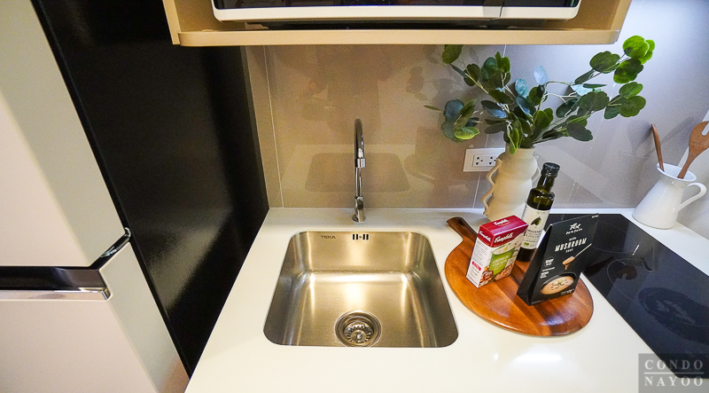 ได้อ่างล้างจานแบบหลุมเดียว และเตาไฟฟ้าพร้อมเครื่องดูดควันของ Teka ท็อปเคาน์เตอร์เป็นหินสังเคราะห์ ส่วนผนังด้านหลังติดกระเบื้องมาให้เช็ดทำความสะอาดได้ง่าย