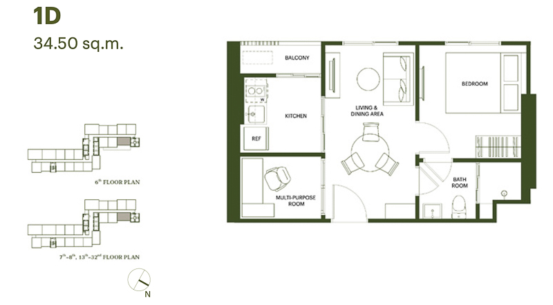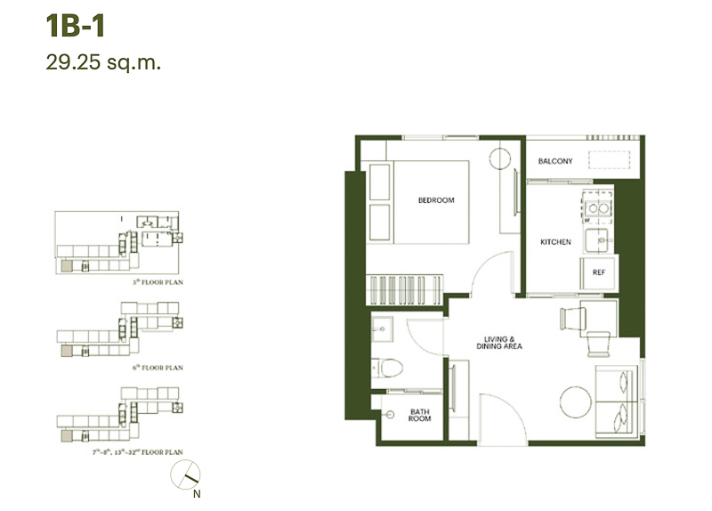 1 Bed ขนาด 29.50-29.75 ตร.ม. จุดเด่นได้แปลนห้องหน้ากว้าง พื้นที่แบ่งเป็นสัดส่วน ห้องนั่งเล่นขนาดใหญ่ใช้งานร่วมกับส่วนรับประทานอาหาร ห้องนอนกั้นผนังแยกเป็นส่วนตัว พื้นที่วางเตียง โต๊ะ ตู้ได้ครบ และได้ห้องครัวปิดอยู่ติดระเบียง ระบายอากาศได้สะดวก
