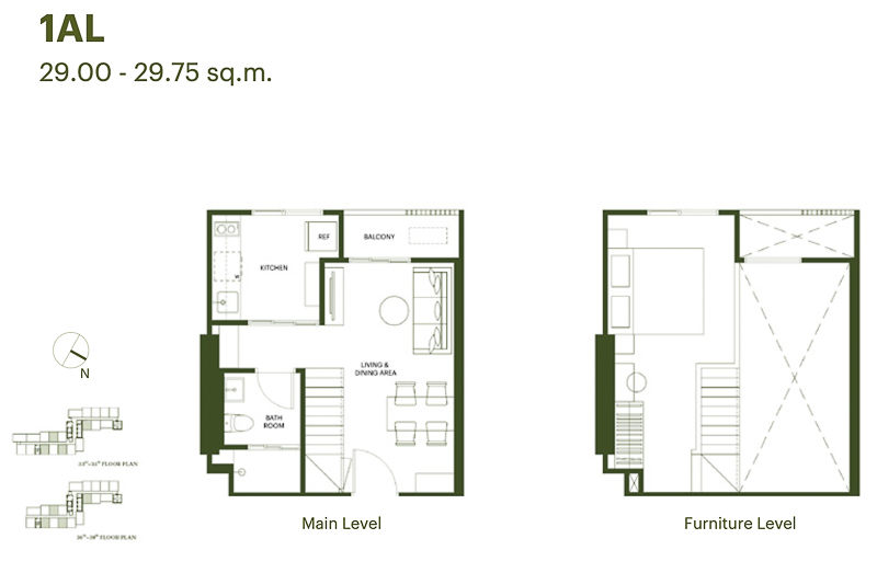 Loft 1 Bed ขนาด 29-30.25 ตร.ม. จุดเด่นส่วนห้องนั่งเล่นและส่วนรับประทานอาหารได้พื้นที่ขนาดใหญ่ใช้งานร่วมกัน และได้ฝ้าเพดานสูง 4.7 ม. ห้องครัวปิดพื้นที่กว้าง ส่วนชั้นลอยเป็นห้องนอนวางเตียง 5-6 ฟุตได้สบาย ๆ และมีพื้นที่วางตู้เสื้อผ้าขนาดใหญ่กับโต๊ะเครื่องแป้งได้อีก