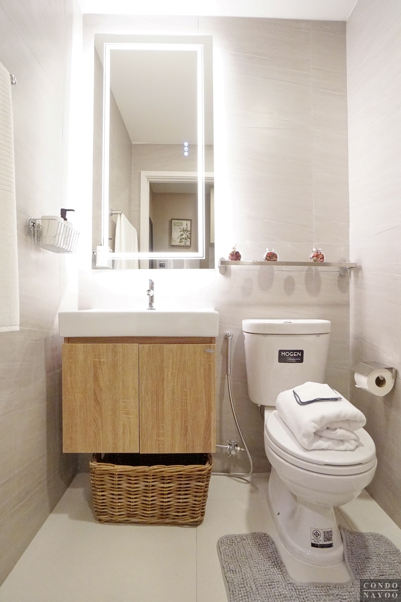 ห้องน้ำ Type นี้จะเป็นห้องหน้ากว้าง ตกแต่งพื้นและผนังด้วยกระเบื้องลายหินคุมโทนสีเบจและสีเทา ดูหรูหรา สบายตาเช่นเดิม ส่วนสุขภัณฑ์ต่าง ๆ ได้มา Spec เดียวกันทั้งโครงการ โดยจะใช้เป็นของ Mogen เป็นหลัก