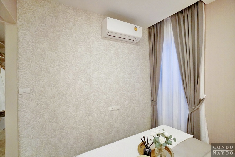 ปลายเตียงนอนจะเป็นผนังเปล่าฉาบเรียบทาสีพื้น สามารถติดทีวีแขวนผนังได้ หรือจะติดชั้นวางของแนวยาว ไว้วางของตกแต่งบ้าน, กรอบรูป หรือของใช้อื่น ๆ ก็ทำได้ตามต้องการ ที่ผนังด้านบนทางโครงการจะติดแอร์ Wall Type มาให้ 1 เครื่อง ส่วนผนังข้าง ๆ กัน จะติดหน้าต่างกระจกบานผสมทรงสูง พร้อมบานฟิกซ์เข้ามุมมาให้ 1 ชุด ใช้เปิดรับแสงธรรมชาติ เปิดระลม และเปิดระะบายอากาศได้อีกด้วย