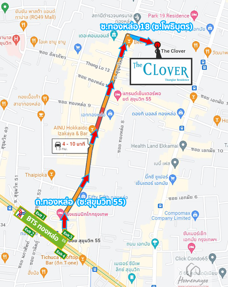 การเดินทาง BTS ทองหล่อ (แยกทองหล่อ)⇒ ถนนทองหล่อ (ซอยสุขุมวิท 55) ⇒ ซอยทองหล่อ 17 (ซอยอรรคพัสดุ) ⇒ ถึงโครงการ The Clover Thonglor 18 *BTS ทองหล่อ≈1.5 กม. หรือ ประมาณ 4-10 นาที*