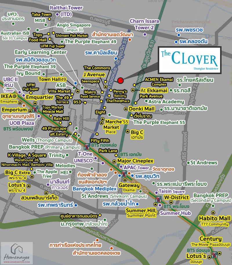 THE CLOVER ทองหล่อ จาก บริษัท ฮาร์ท ออฟ ลิฟวิ่ง จำกัด ตั้งอยู่ในซอยทองหล่อ 18 ถนนสุขุมวิท 55 แขวงคลองตันเหนือ เขตวัฒนา กรุงเทพ ใกล้รถไฟฟ้า BTS ทองหล่อ และ ถนนสุขุมวิท ใกล้ Market Place, J Avenue ทองหล่อ, The Commons, Ekamai International School และ รพ.สมิติเวช สุขุมวิท