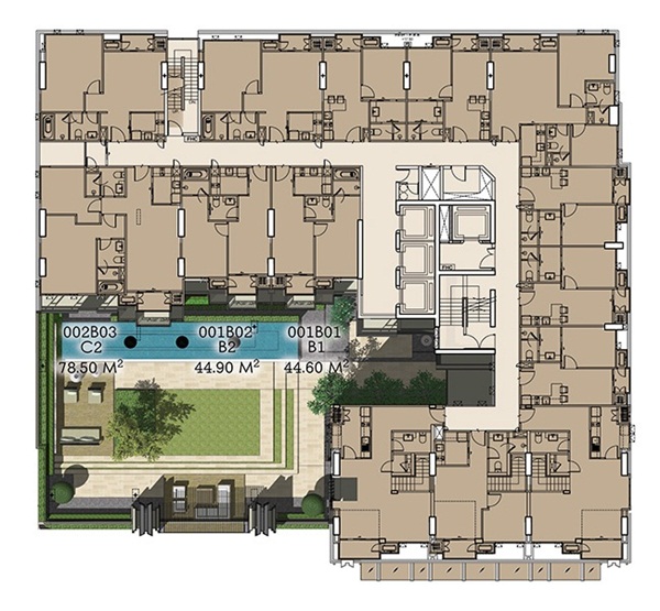 | ลักษณะห้องและขนาดห้อง | 1 Bed / 35 – 53.7 ตร.ม. 2 Bed / 65.1 – 78.5 ตร.ม Penthouse / 87.9 – 101.5 ตร.ม. Duplex / 83.2 – 111.5 ตร.ม. |