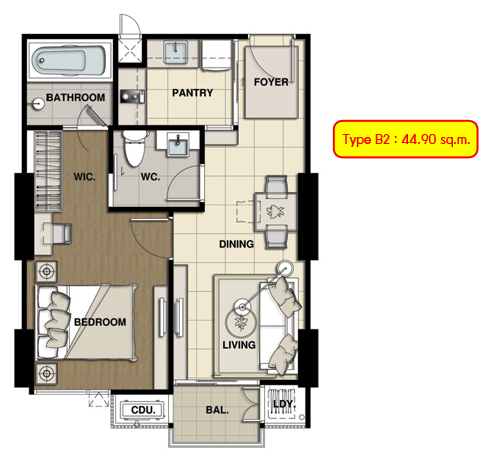 แปลนห้อง Type B2 ขนาด 44.90 ตร.ม. เปิดประตูเข้ามาเป็นพื้นที่ของ Foyer มี Pantry แบบปิด ถัดเข้าไปด้านในเป็นห้องนั่งเล่นและมีระเบียงอยู่ด้านนอก อีกด้านเป็นห้องนอน ห้องน้ำสามารถเข้าออกได้สองทางโดยแบ่งเป็นสองส่วนคือห้องน้ำและห้องอาบน้ำ