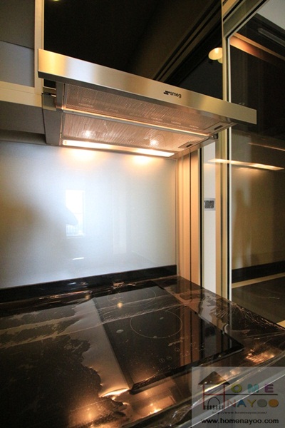 มองย้อนกลับมายังฝั่งทางเข้าห้อง จะเห็นว่าห้องครัวมีกระจกบานใหญ่ทำให้เวลาเข้าครัวแล้วไม่รู้สึกอึดอัด