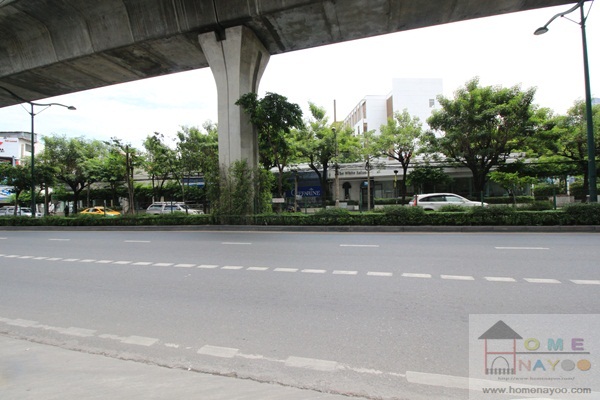 ถนนกว้างฝั่งละ 3 เลน มีเกาะกลางถนนและด้านบนคือรางรถไฟฟ้า BTS