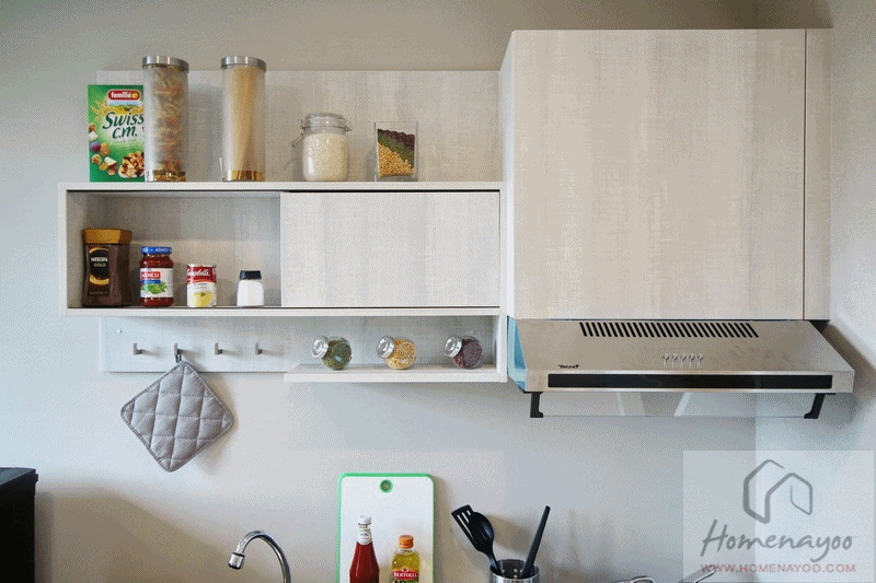 ตู้เก็บของด้านบนแบบบานเปิด พร้อมชั้นสำหรับวางเครื่องปรุง และแผงตะขอสำหรับแขวนอุปกรณ์ของใช้ในครัว