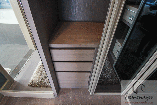 เรามาดูด้านหลังบานประตูกันก่อน ด้านหลังบานประตูเราจะได้ Shoes Cabinet ภายในเปิดออกมามีชั้นวางหลายชั้น พร้อมลิ้นชักเก็บของกระจุกกระจิก และตู้ไฟ