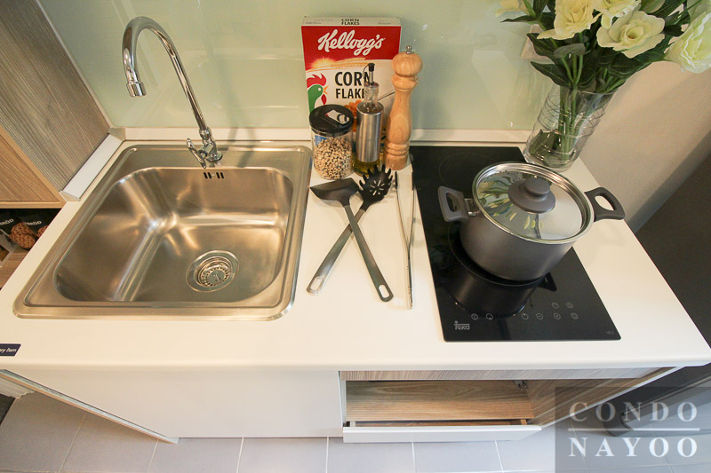 เค้าเตอร์ที่ให้เป็นแบบเดียวกับห้องแรก แบ่งเป็นวิงค์ล้างจานและเตา เคาน์เตอร์ฝั่งเตามีชั้นวางไมโครเวฟที่ด้านล่าง