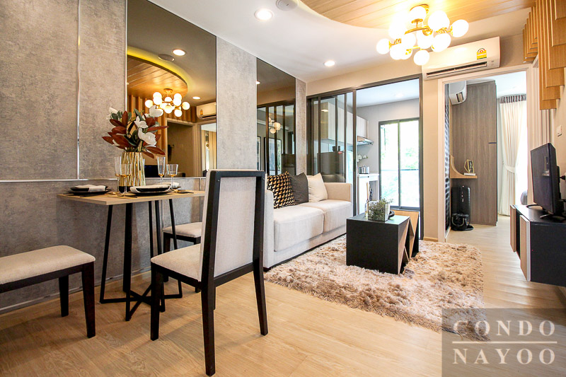 ขอจบการพาชมห้องตัวอย่างไปด้วยภาพรวมของพื้นที่ห้องทานอาหารและห้องนั่งเล่น ในมุมที่ออกจากห้องนอนรองค่ะ