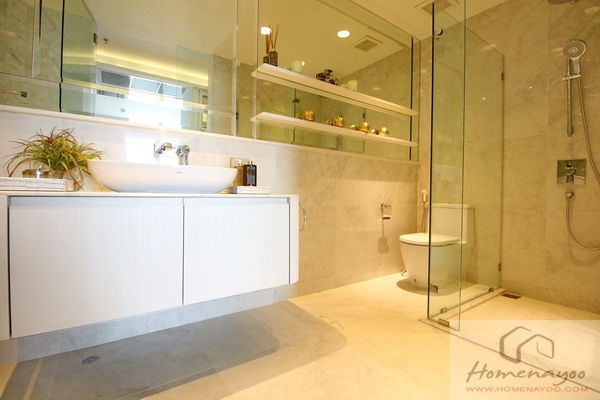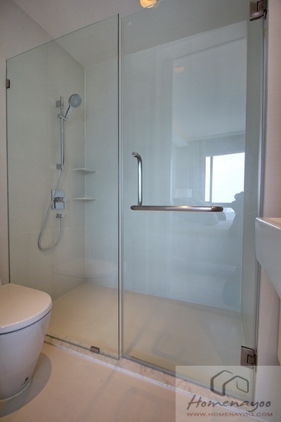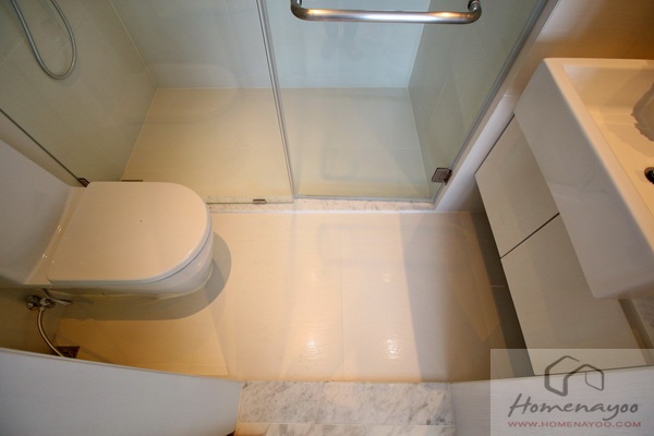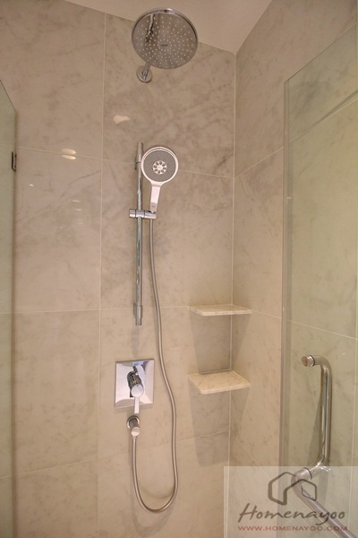 ราวแขวนฝักบัวปรับระดับได้ แยก Rain Shower ฝังด้านบน ผนังด้านหลังปูด้วยหินอ่อนมีช่องสำหรับวางของ