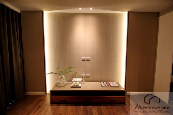 ปลายเตียงมีชั้นวางทีวีให้ ผนังดรอปเข้าไปด้านในเพื่อซ่อนรางไฟด้านข้าง