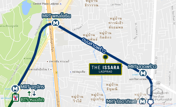 ทำเลที่ตั้งโครงการ : The Issara ลาดพร้าว ตั้งอยู่บนถนนลาดพร้าวช่วงต้นใกล้ห้าแยกลาดพร้าวและแยกรัชดา-ลาดพร้าว ทำเลดังกล่าวถือว่าอยู่ในจุดยุทธศาสตร์ที่ดีมีจุดเชื่อมถนนเส้นสำคัญหลายเส้น รถไฟฟ้า ทางด่วนรวมถึงความอุดมสมบูรณ์ ในเรื่องของการเดินทางนั้นตัวสถานีรถไฟฟ้าหรือทางด่วนเองอาจจะไม่ได้อยู่ในตำแหน่งที่ดีที่สุดถึงกับขึ้นออกจากหน้าบ้านขึ้น MRT ได้เลยหรือขับรถออกจากโครงการแล้วมีทางด่วนมารอรับ แต่ชดเชยด้วยการที่มีทางเลือกที่หลากหลายให้สามารถใช้งานได้อย่างคลอบคลุมนั่นเอง