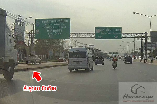 ตรงบริเวณสะพานเข้าลำลูกกาให้ดูตามเส้นสีแดงครับ ระวังเข้าผิดไปช่องซ้ายสุดนะครับ ช่องนั้นเป็นช่องออกทางขนานไปตลาดสี่มุมเมือง