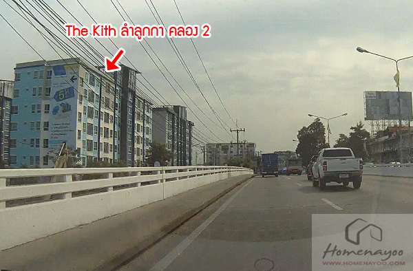 ขึ้นสะพานข้ามคลอง 2 มองเห็นหมู่ตึกของโครงการ The Kith ลำลูกกา คลอง 2 อยู่ทางซ้ายมือ