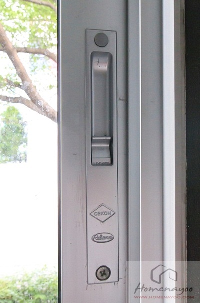 ประตูบานเลื่อนอลูมิเนียมวางบนธรณีก่อกันน้ำสาดสูงประมาณ 10 ซม.