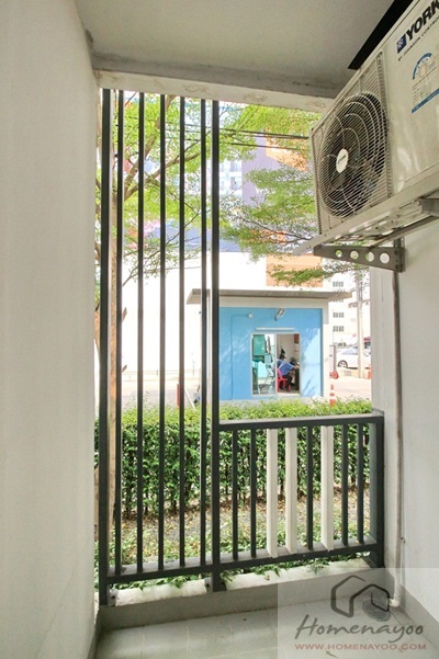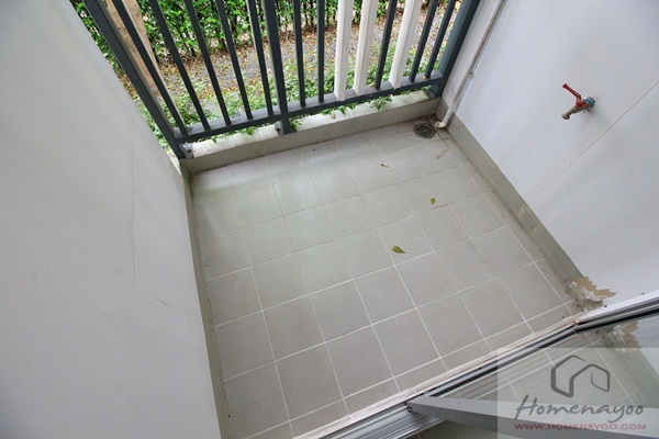พื้นที่ระเบียงกว้างขนาดประมาณ 0.9 x 0.8 เมตร มีต่อท่อน้ำดีและท้อน้ำทิ้งให้พร้อมใช้งาน