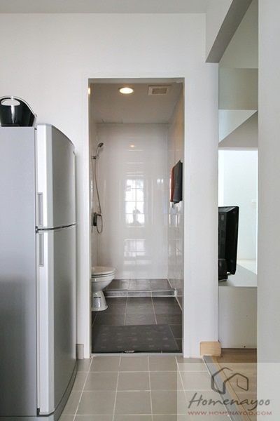 พื้นห้องน้ำถูกลดระดับลงเล้กน้อยราว 3 ซม. กันน้ำไหลไปห้องครัว