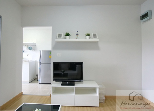ฝั่งชั้นวางทีวีให้เป็นแบบนี้ ต่างจากห้องตัวอย่างเมื่อสักครู่ตรงที่ไม่ได้มีชั้นวางของด้านข้างให้ เกือบลืมบอกไปว่าเขาแถมทีวีให้ด้วยนะ