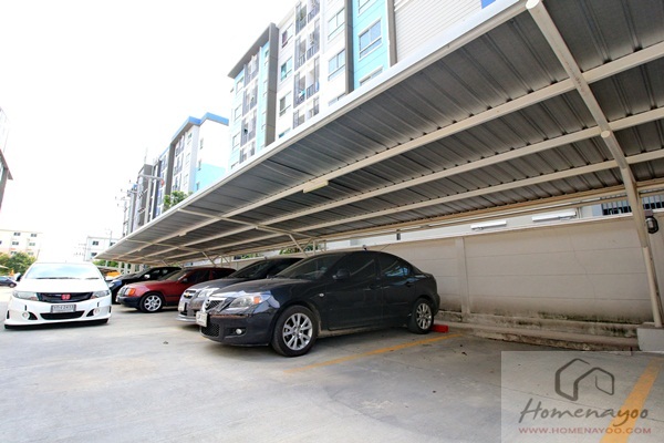 ลานจอดรถด้านนึงมีกันสาดให้ โดยที่จอดรถรวมทั้งโครงการอยู่ที่ 35% รวมซ้อนคันแล้ว