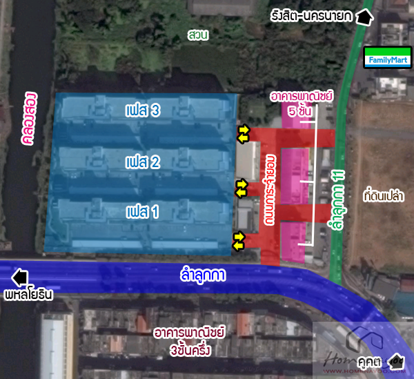 ภาพมุมสูงบริเวณโครงการ พื้นที่โครงการตั้งอยู่บริเวณหัวมุมที่ติดกับถนนใหญ่ลำลูกกาและซอยลำลูกกา 11 ด้านหลังโครงการติดกับคลองสอง และทิศเหนือเป็นพื้นที่สวนเปล่ายังไม่มีสิ่งก่อสร้าง ตัวโครงการแบ่งออกเป็น 3 เฟสที่แยกนิติและทางเข้าออกจากกันชัดเจน โดยมีถนนภาระจำยอมใช้ร่วมกัน บริเวณด้านหน้าโครงการมีอาคารพาณิชย์สูง 5 ชั้น ที่พอจะมีร้านค้าร้านบริการเช่นร้านทำฟัน ไปรษณีย์ ร้านของชำ ร้านกาแฟและอาหารตามสั่งเป็นต้น ข้ามซอยลำลูกกา 11 เยื้องๆมีร้านสะดวกซื้อ Family Mart ส่วนโลตัสให้เดินไปตามถนนลำลูกกาลึกเข้าไปทางคูคตห่างจากโครงการอีกประมาณ 500 เมตรซึ่งเป็นระยะที่เดินได้ครับ