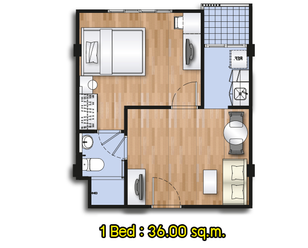 แปลนห้องขนาด 28 ตร.ม. ออกแบบได้ครบครันทุกฟังก์ชั่นตามการใช้งานสำหรับอยู่อาศัยจริง เปิดประตูห้องมาส่วนแรกเจอกับห้องนั่งเล่นที่วางโต๊ะทานอาหารขนาด 2 ที่นั่งเข้ามุม ถัดไปด้านในเป็นห้องนอนแบ่งส่วนด้วยประตูบานเลื่อน พื้นที่อีกด้านเป็นห้องครัวขนาดกะทัดรัดที่ไม่ได้มีในส่วนของเตาไฟฟ้าให้ ด้านนึงของครัวเป็นระเบียงซักล้างที่ใช้สำหรับวางเครื่องซักผ้าและแขวนคอมแอร์ ส่วนอีกด้านเป็นห้องน้ำที่มีการแยกพื้นที่ส่วนแห้งส่วนเปียกให้
