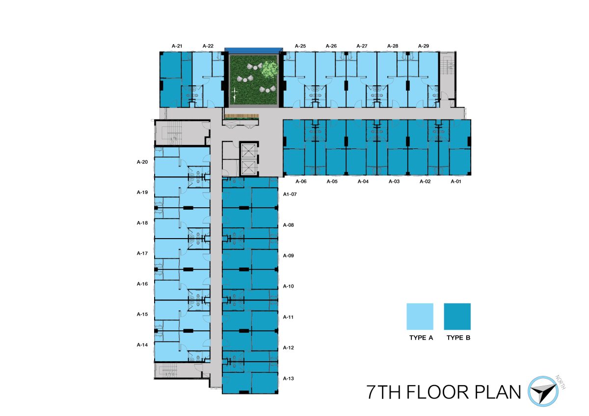 2nd Floor Plan อาคาร A เป็นส่วนพักอาศัยและ Green Roof มีลิฟท์โดยสาร 2 ตัว และบันไดหนีไฟ 3 จุด ทางเดินกว้าง 1.5 เมตร มีห้องพักทั้งหมด 29 ยูนิต แบ่งเป็น Type A จำนวน 15 ยูนิต หันระเบียงออกทางด้านนอกโครงการทั้งหมด และ Type B จำนวน 14 ยูนิต ส่วนใหญ่จะหันระเบียงเข้าสู่ด้านในโครงการ ได้วิวจากส่วนกลาง