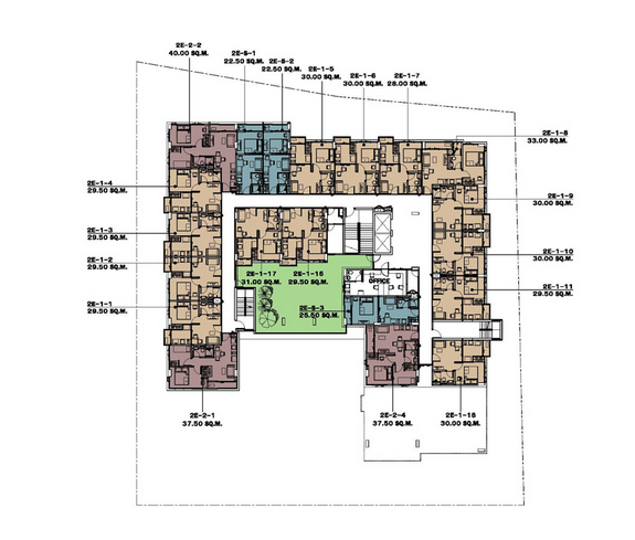 | ลักษณะห้องและขนาดห้อง | – Studio (22.5 – 25.5 ตร.ม.) – 1 Bed (28 – 34 ตร.ม.) – 2 Bed (25.5 – 45 ตร.ม.) |