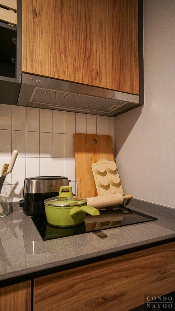 ห้องครัวได้พื้นที่มากว้างดี แบ่งชุดครัวและพื้นที่วางของไว้คนละฝั่ง ตรงกลางยังมีพื้นที่เหลือให้ยืนทำอาหาร ล้างจาน และเดินเข้า-ออกห้องพักได้สะดวก