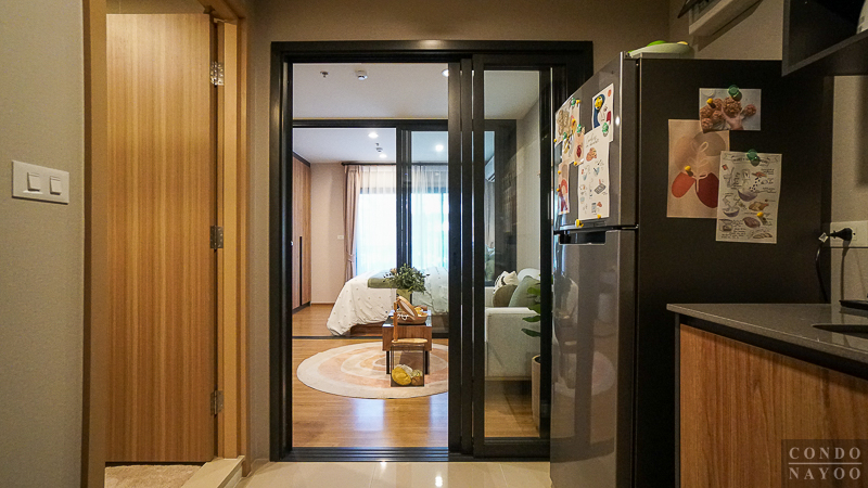 ถัดจากห้องครัวเข้าไป จะเจอห้องนั่งเล่นตรงกลางห้องพัก และตรงนี้จะกั้นประตูกระจกบานเลื่อน 3 ตอน แยกพื้นที่ไว้ให้ด้วย