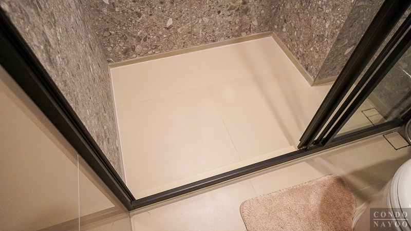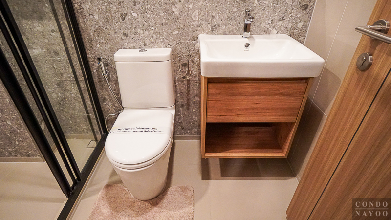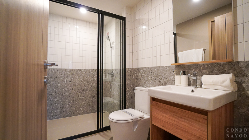 ห้องน้ำของคอนโดนี้ จะเป็นห้องน้ำสำเร็จรูป ตกแต่งกระเบื้องเล่นลายสวยงาม มีการแบ่งพื้นที่ส่วนแห้ง กั้นแยกส่วนอาบน้ำไว้ให้เรียบร้อย สุขภัณฑ์ที่ได้เป็นของ Cotto และมีพัดลมระบายอากาศติดไว้ที่ฝ้าเพดาน 1 ตัว