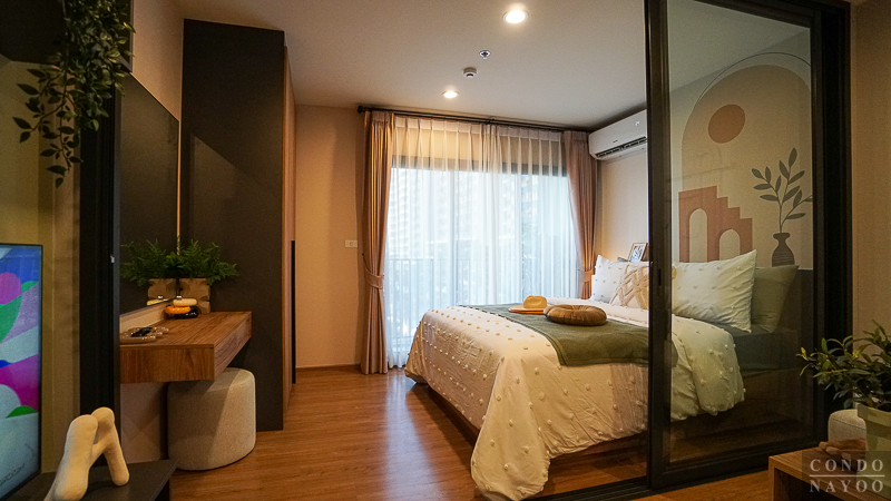 ด้านในสุดจะเป็นห้องนอนและระเบียง กั้นแยกพื้นที่โซนนี้ด้วยประตูกระจกบานเลื่อน 3 ตอน แบบ Full Height ที่ช่วยให้ห้องดูโปร่งและกว้าง พักผ่อนได้สบาย ไม่อึดอัด