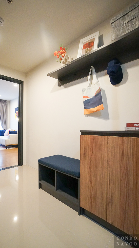 ขวามือมีพื้นที่แนวยาวให้วางตู้เก็บรองเท้า ม้านั่งใส่รองเท้า หรือจะ Built-in ตู้อเนกประสงค์ขนาดใหญ่เพื่อเพิ่มพื้นที่เก็บของไปเลยก็ได้