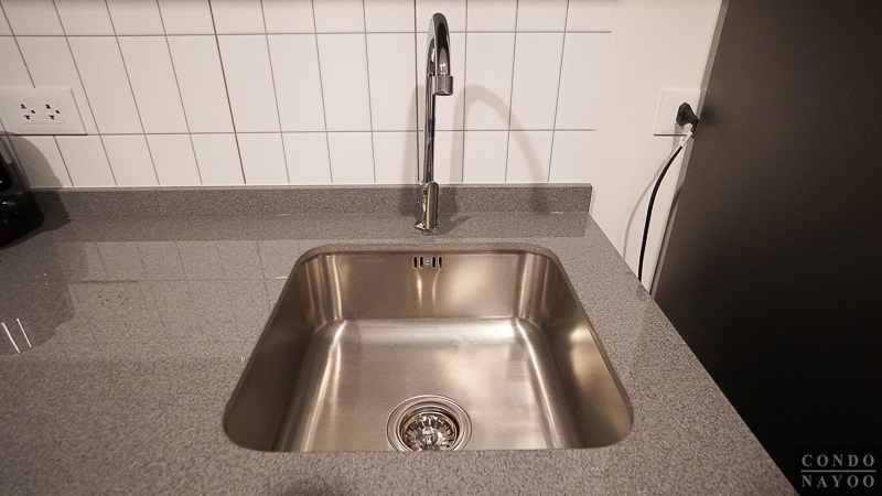 ได้ Sink สแตนเลสหลุมเดี่ยวแบบฝังเคาน์เตอร์ พร้อมก๊อกน้ำก้านโยกทรงสูง มีการเว้นพื้นที่รอบอ่างเพื่อให้วางของใช้ในครัวได้แบบไม่เกะกะ