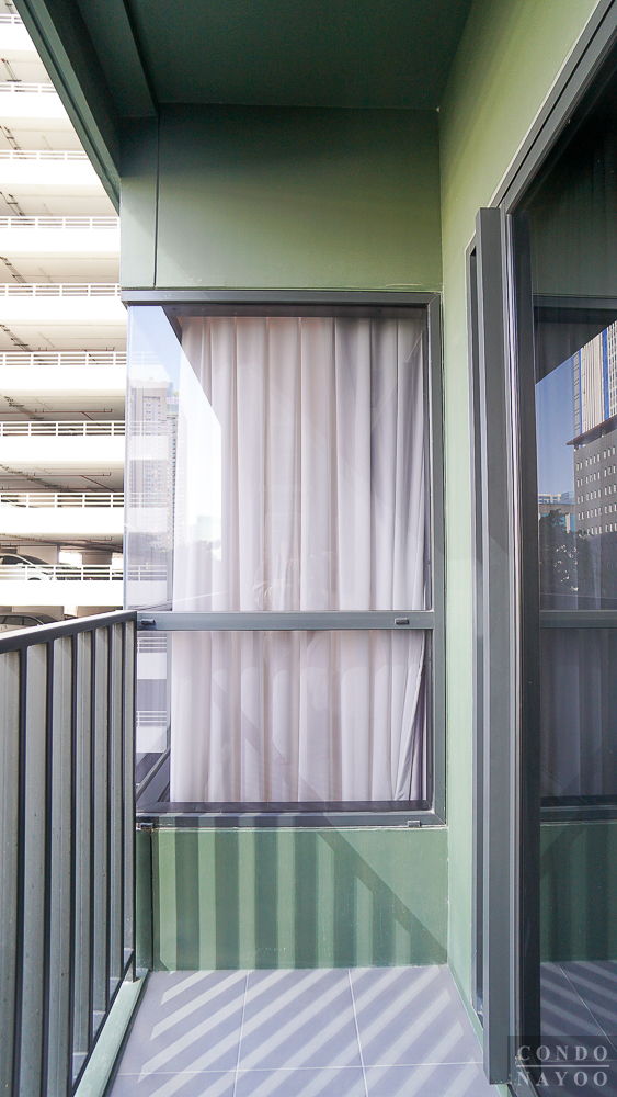เปิดออกมาจะเจอระเบียงขนาดใหญ่ ปูพื้นกระเบื้องเซรามิกกันลื่น และติดราวกันตกมาให้แล้ว พื้นที่ตรงนี้ยังสามารถจัดสวนสวย ๆ หรือวางราวตากผ้าได้