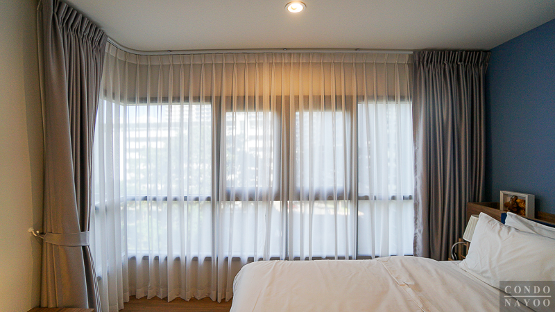 ข้างเตียงนอนจะเป็นประตูกระจกบานเลื่อนขนาดใหญ่ ที่ใช้เปิดเชื่อมกับระเบียงภายนอก