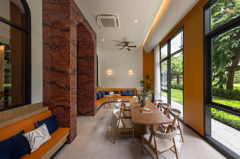 ผ่านห้องครัวเข้ามาที่ด้านใน จะเจอกับห้องนั่งเล่นและมุมทานอาหารขนาดใหญ่ ที่รองรับการจัดวางเฟอร์นิเจอร์และจัดฟังก์ชันการใช้งานได้หลากหลาย