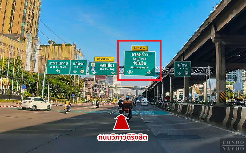 ลงสะพานมาห้าแยกลาดพร้าว แล้วเบี่ยงซ้ายไปถนนพหลโยธิน