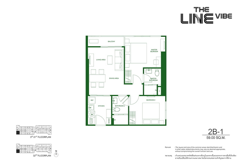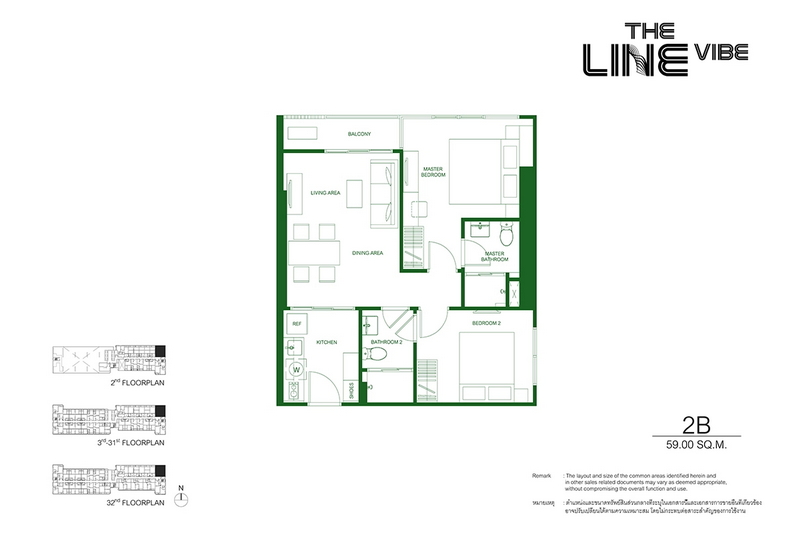 มาดูแปลนห้องตัวอย่างห้องต่อมา คือ Type 2B แบบ 2 ห้องนอน 2 ห้องน้ำ ขนาด 59.00 ตร.ม. รองรับการอยู่อาศัยแบบครอบครัวเริ่มต้น 2-3 คนได้สบาย ภายในห้องวาง Layout เหมือนอยู่บ้าน พื้นที่แต่ละโซนใช้งานได้จริงและมีความเป็นส่วนตัวจากกัน