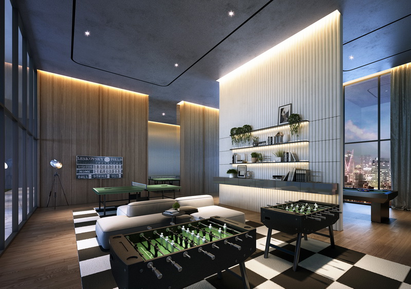 ภาพจำลองบรรยากาศ Board Game room มีมุมพักผ่อนและชั้นวางของสำหรับวางบอร์ดเกมต่างๆ