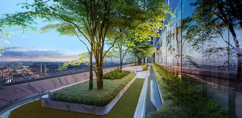 ภาพจำลองบรรยากาศโครงการจากมุมสูง จะเห็นว่าชั้นดาดฟ้ามีสวนและพื้นที่ส่วนกลาง