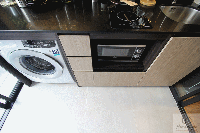ด้านล่างเป็นตู้และลิ้นชักเก็บของ จะเห็นว่าทางโครงการมีตะแกรงสำหรับวางจานและ ช่องสำหรับวางไมโครเวฟและเครื่องซักผ้า