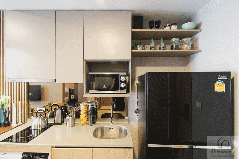 ด้านบนเป็นชั้นและตู้เก็บของ หรืออ่างล้างจานมีชั้นสำหรับวางไมโครเวฟซึ่งลดระดับลงมาเล็กน้อยทำให้ใช้งานได้สะดวก
