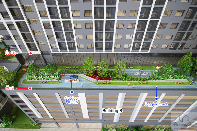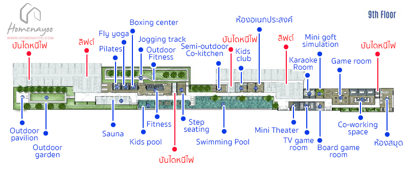 ผังอาคารชั้น 9 ซึ่งเป็นชั้นเริ่มต้นของห้องพักอาศัย แต่ละอาคารจะมีลิฟต์โดยสารแยกส่วนกัน ชั้นนี้เป็นชั้นของพื้นที่ส่วนกลางด้วยซึ่งเป็นพื้นที่ของสองอาคารเชื่อมต่อกัน ทำให้มีส่วนกลางที่หลากหลาย ทั้งสระว่ายน้ำขนาดใหญ่ถึง 85×5 ม. แยกสระเด็กและสระผู้ใหญ่ มีพื้นที่นั่งริมสระ ห้องต่างๆริมสระก็เป็นสวนกลางที่มีทั้งสวนสาธารณะ, ห้องฟิตเนส, ห้องสันทนาการอื่นๆหลากหลายทั้งสำหรับเด็กและผู้ใหญ่ เรียกได้ว่ามีให้อย่างครบครันเลยค่ะ