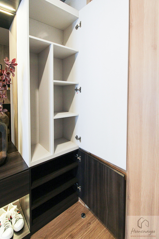 ทำเป็นตู้เก็บของและตู้รองเท้าแบบนี้ หรือถ้าใครมีรองเท้าหลายคู่ก็ทำเป็นตู้รองเท้าเต็มบานก็ได้ค่ะ