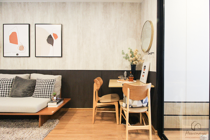 มุมนั่งเล่นสามารถวางโซฟาสำหรับ 2 ที่นั่ง พื้นที่ด้านข้างเหลือสามารถวางเป็นชั้นวางของเล็กๆได้ ด้านหน้าวางโต๊ะกาแฟและเบาะรองนั่งเล็กๆไว้นั่งเสริมหรือวางเท้า